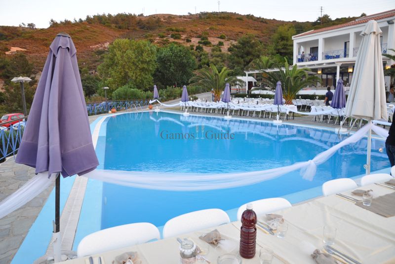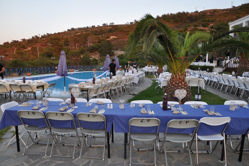 Η δεξίωση μπορεί να λάβει χώρα στο εξωτερικό χώρο του ξενοδοχείου κοντά στην πισίνα με εξαιρετική θέα προς το Αιγαίο και με διακόσμηση της επιλογής σας. Η υπηρεσία τροφοδοσίας μας είναι εξαιρετική με ικαριώτικες συνταγές βασισμένες σε ντόπια υλικά αλλά και πιάτα gourmet.